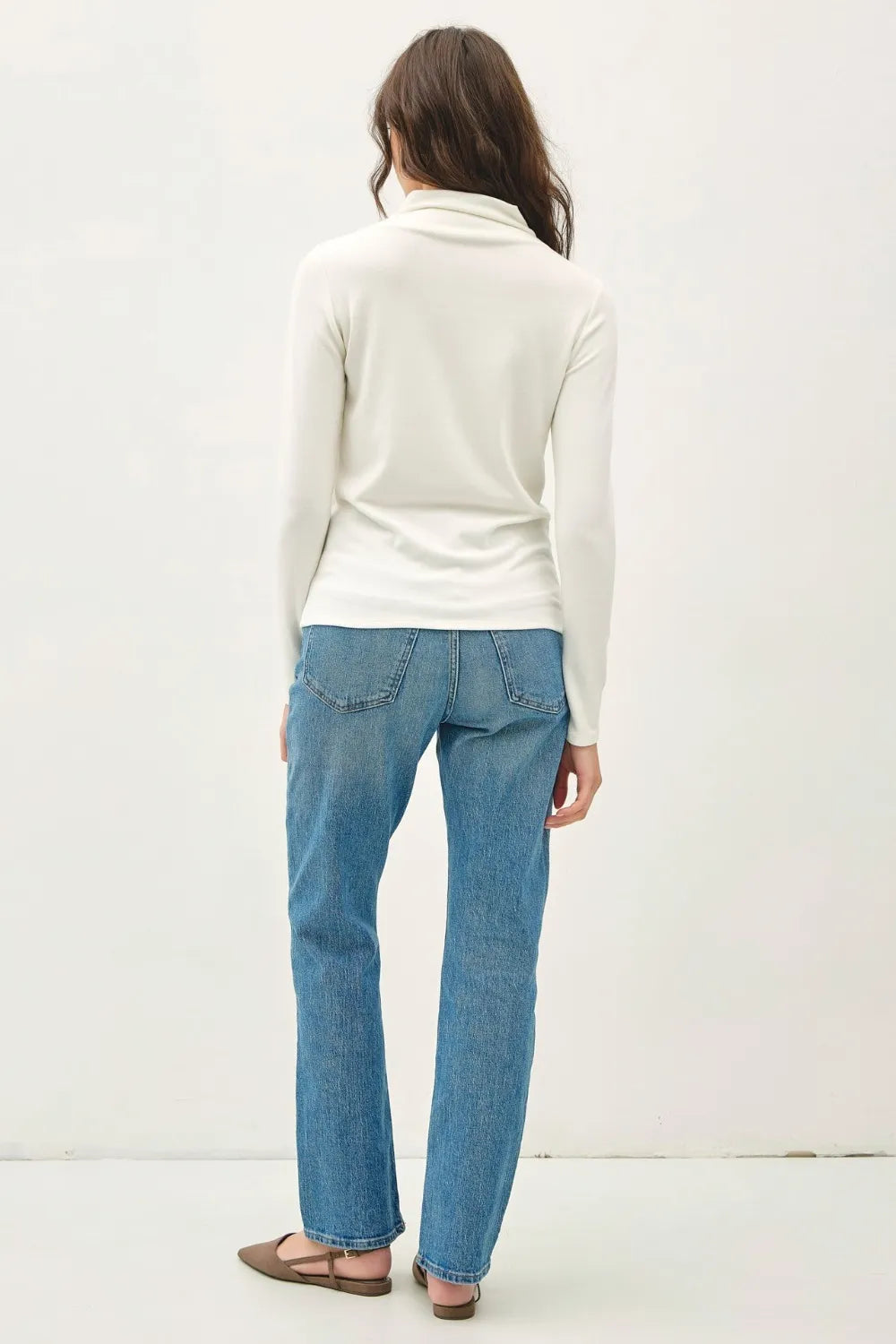 The Mock Neck Long Sleeve T-Shirt is a versatile and modern essential for any wardrobe. Featuring a stylish mock neck design and long sleeves, this t-shirt offers a chic and sophisticated look that can be easily dressed up or down. The soft and stretchy fabric provides a comfortable and flattering fit, making it a go-to piece for layering or wearing on its own. Whether paired with jeans for a casual ensemble or styled with trousers for a more polished outfit, this mock neck long sleeve t-shirt is a versatile and stylish option that effortlessly transitions from day to night. Add this piece to your collection for a touch of elevated simplicity in your everyday looks.